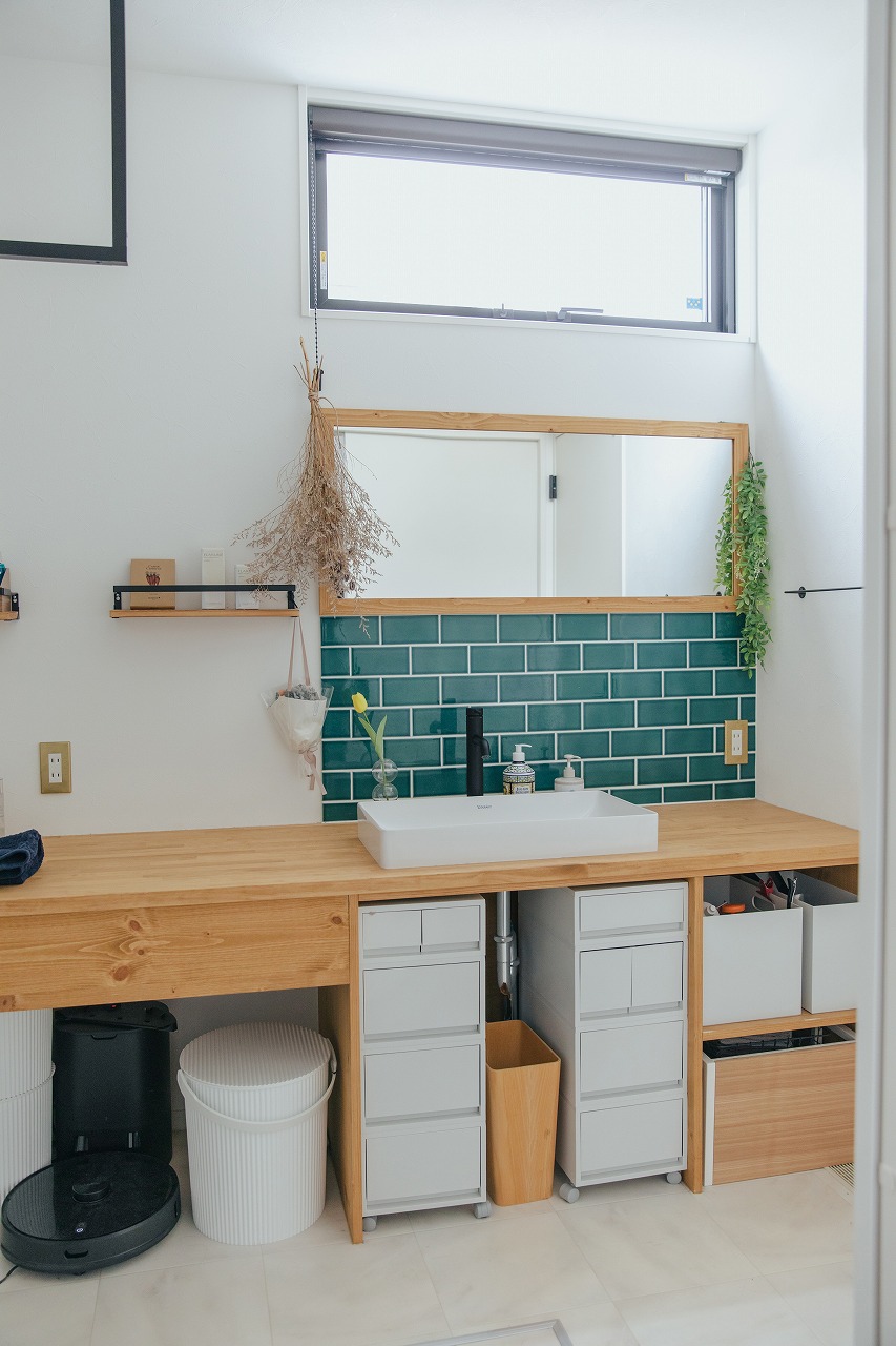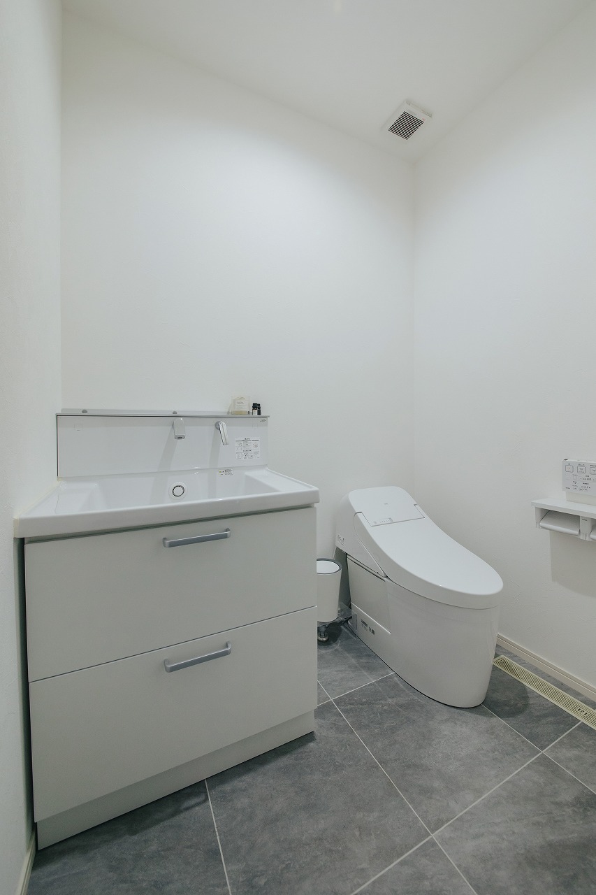 WCの個室内に大きな洗面を備え付けて、ホテルライクな印象
