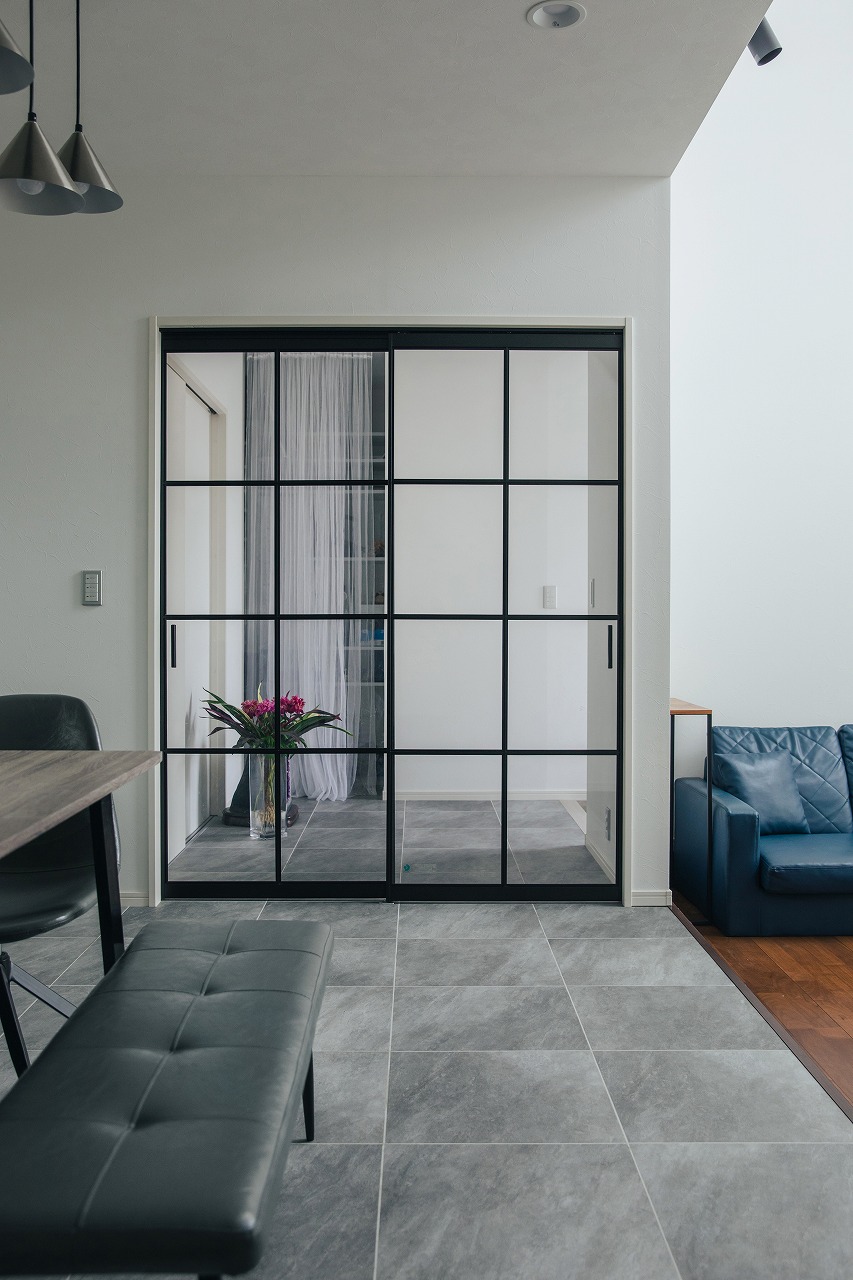 玄関からリビングへの扉をガラス戸にすることでより開放的で明るい空間を作っています。