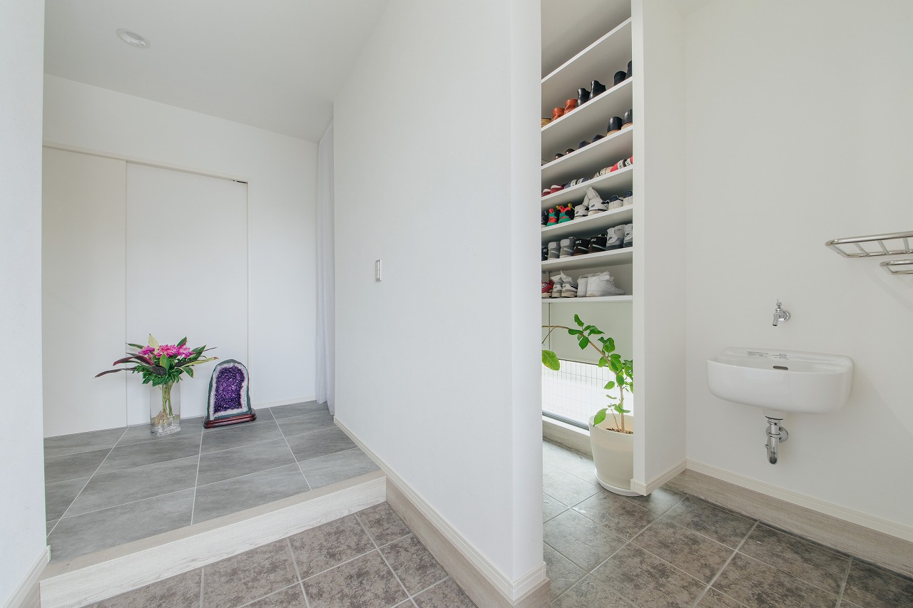 玄関を入ると、靴をあつめるのがお好きだというご夫婦様こだわりの大きなシューズクロークが。セカンド洗面→シューズクローク→ファミリークローク→パントリーを抜けてキッチンへと繋がっているので、帰宅後スムーズに収納が出来て、リビングはいつもスッキリ。