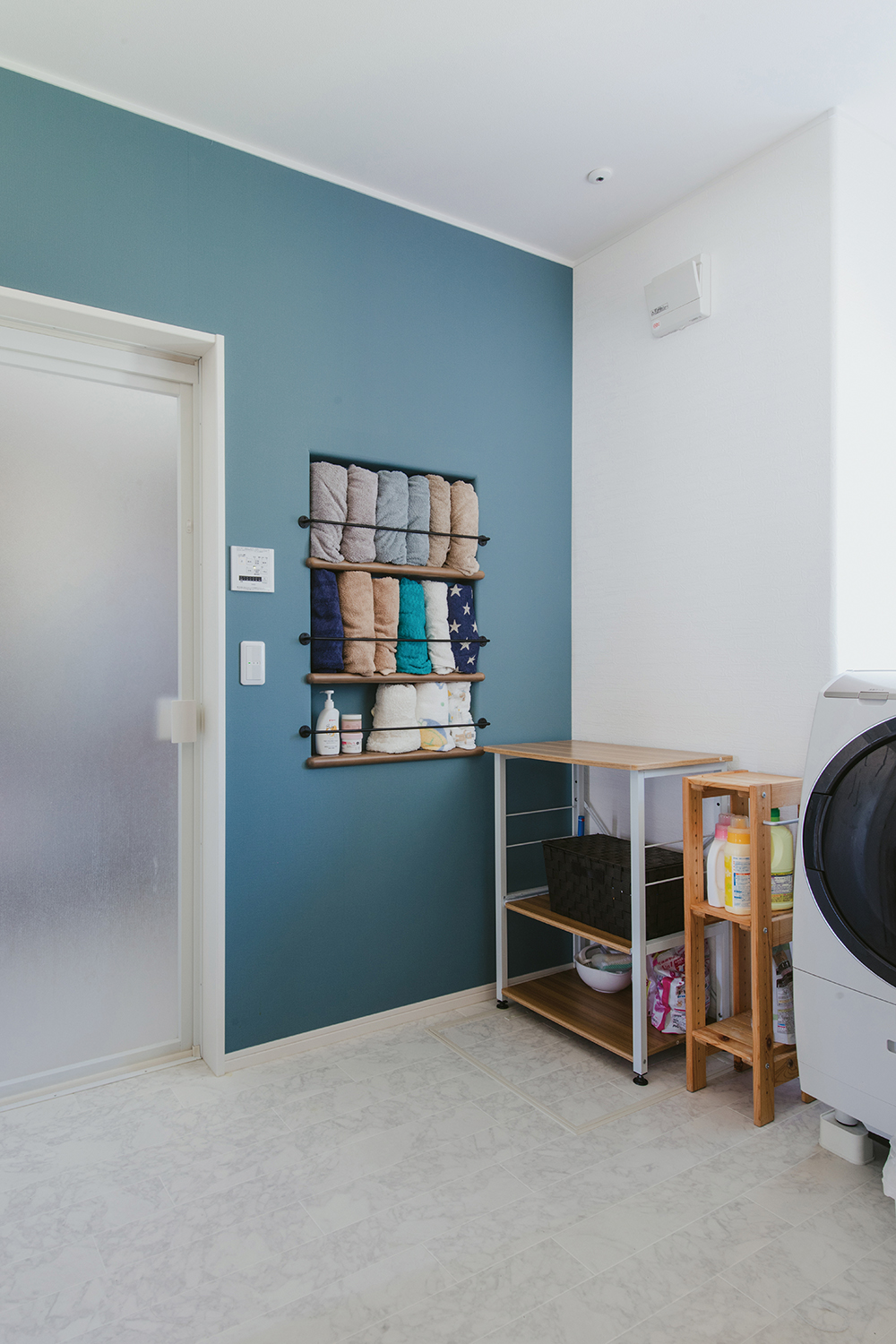 室内干しもできる脱衣室。アクセントクロスで遊び心をプラスしました。タオルを立てて収納できるスタイルはインスタグラムを参考にして取り入れたお気に入りのスタイルです。
