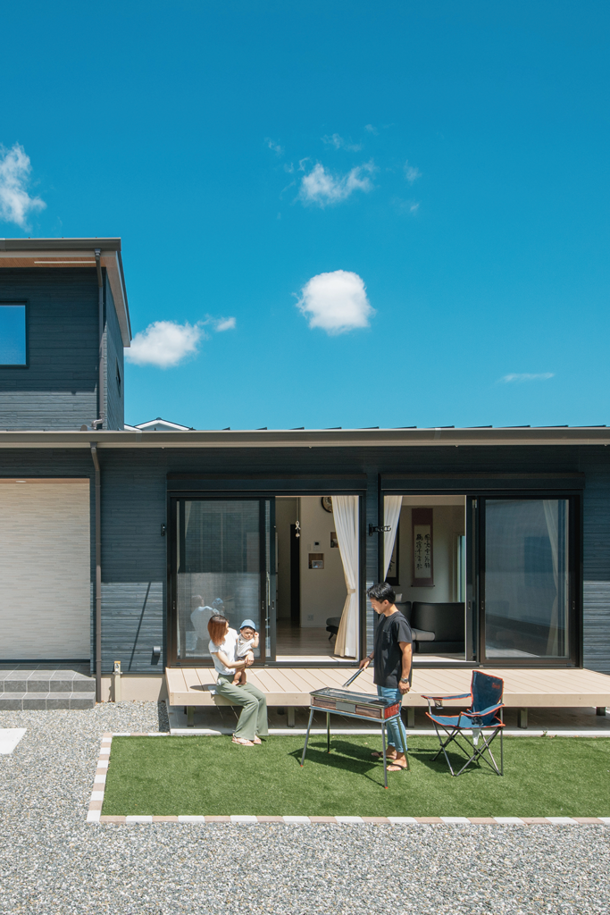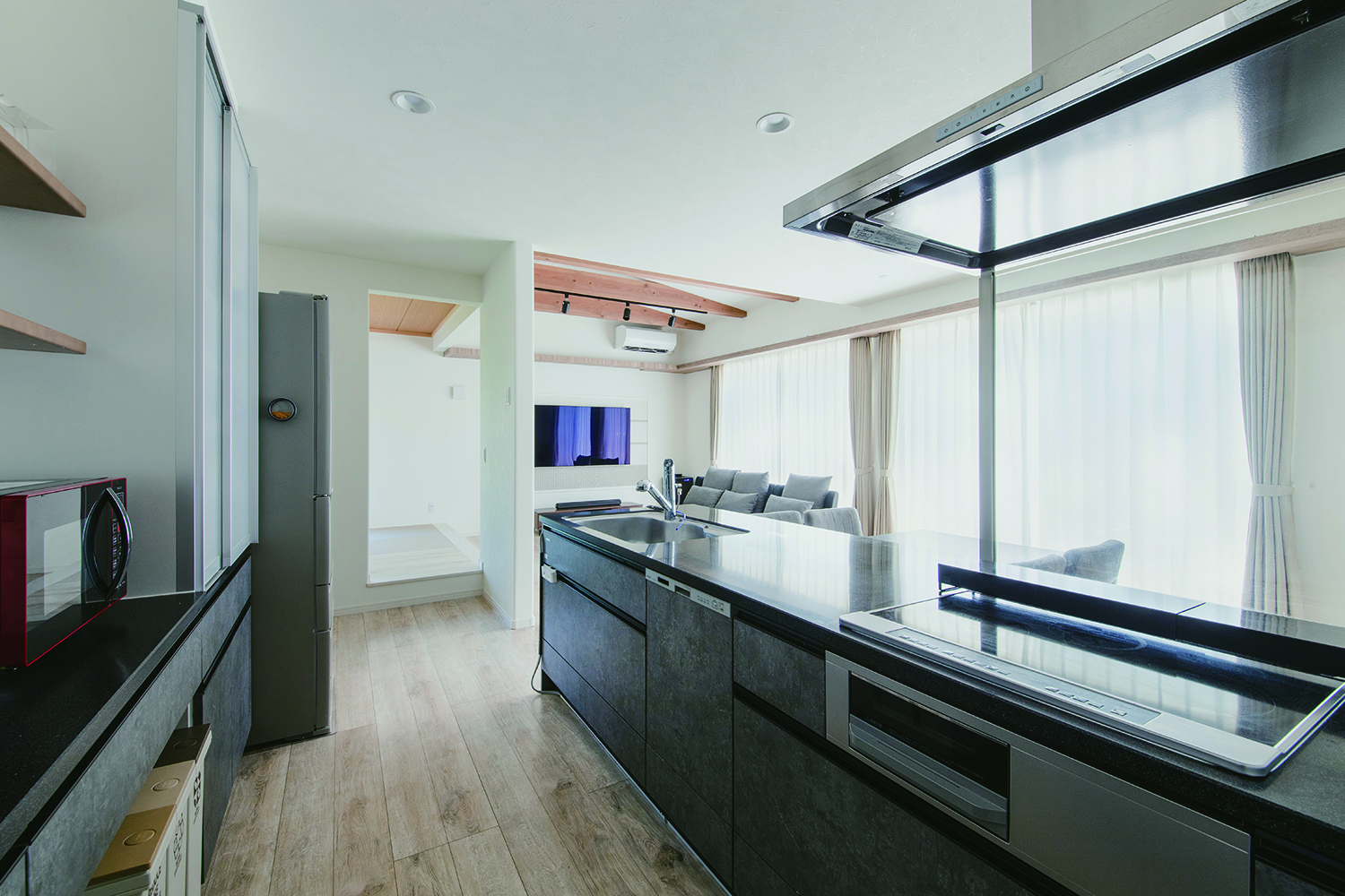 勾配天井で、梁を見せるデザインのリビング。天井高をかえることで、続き間の空間もゆるやかにゾーニングしました。