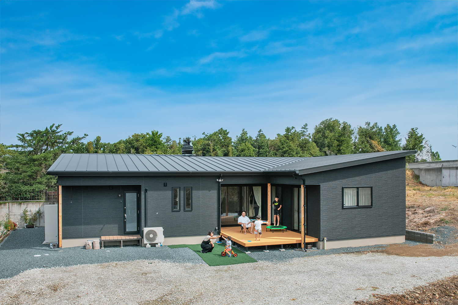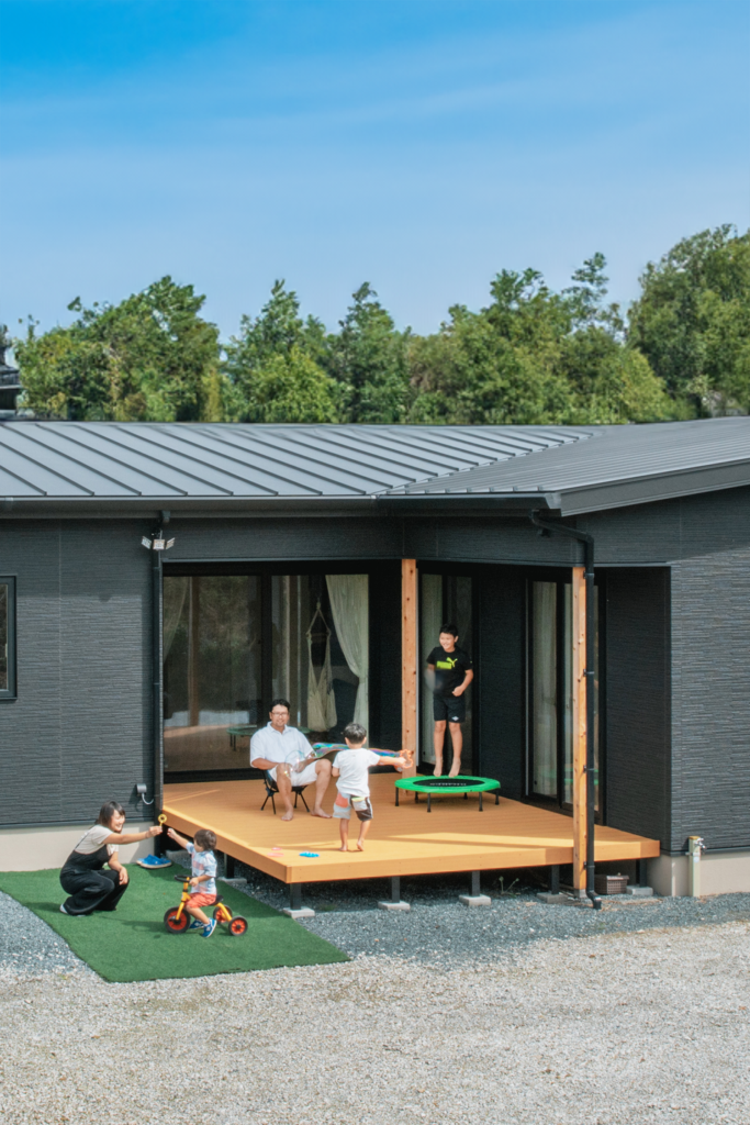 ウッドデッキはダイニング、リビング、子供部屋前の廊下の3方向から出入りができて、通路としても