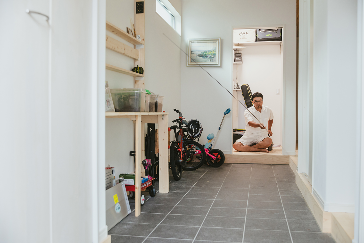 趣味の釣りの仕掛けを作る際には、竿を長く伸ばして作業することが出来る、こだわりの空間です。