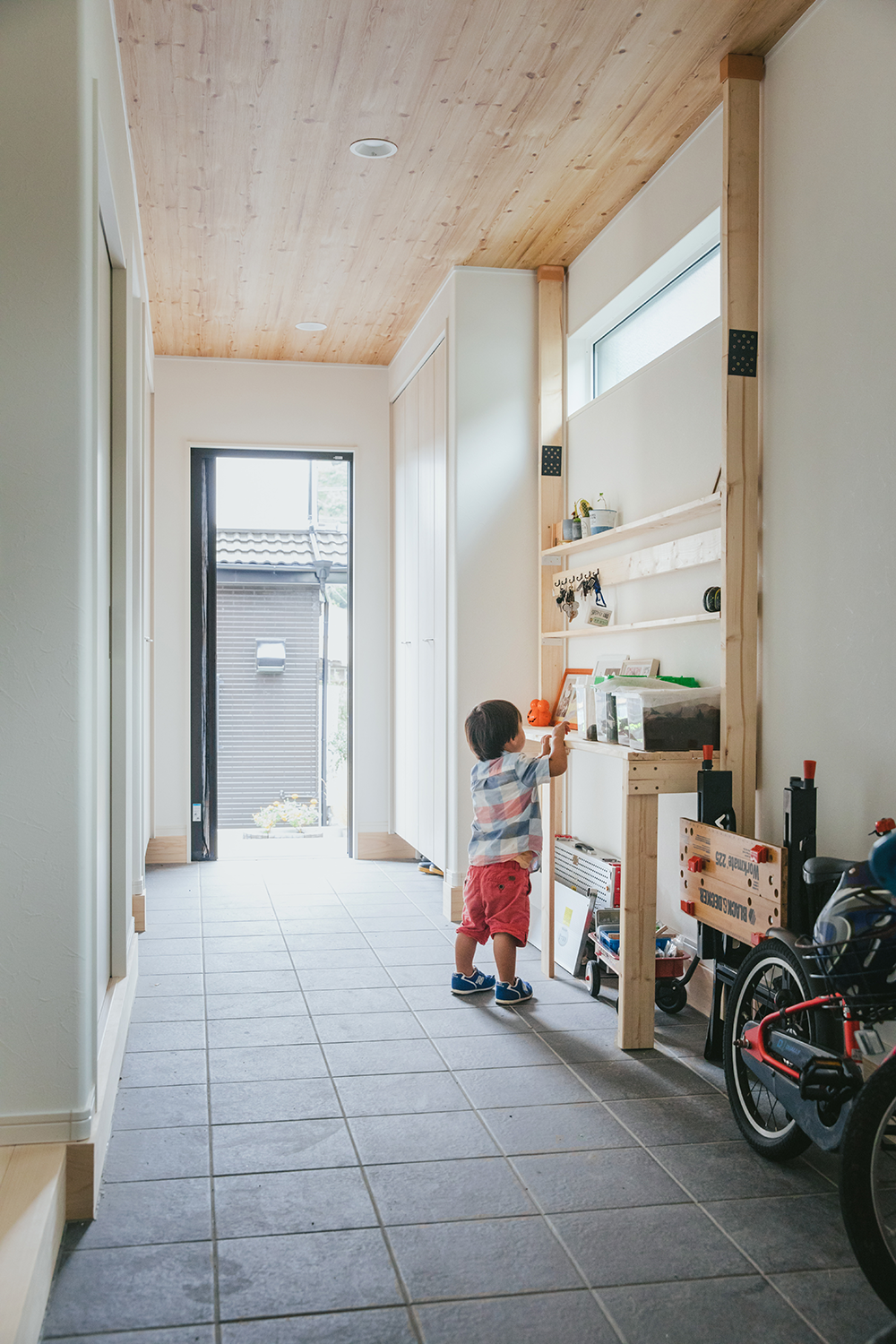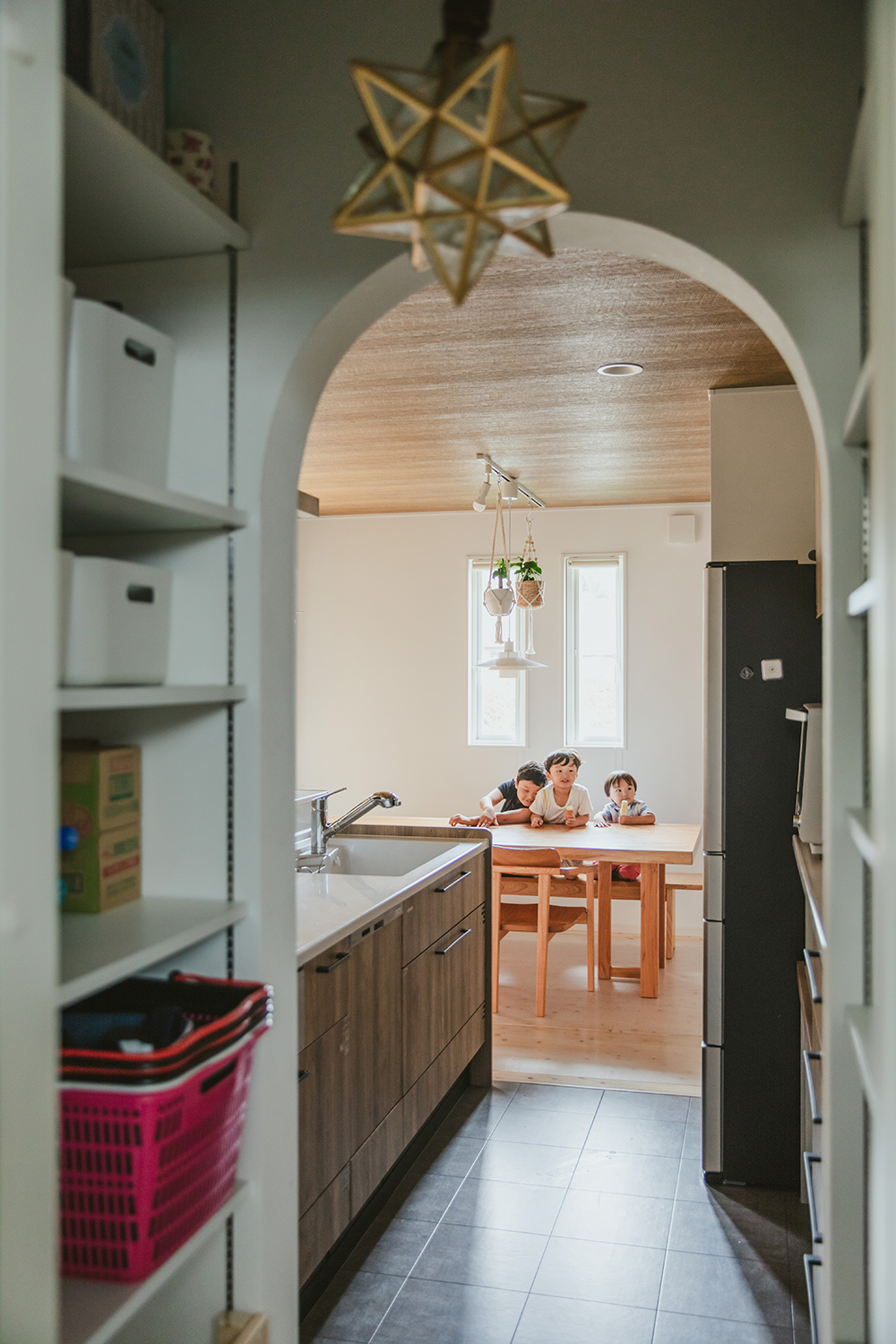 玄関土間から直接パントリーにあがり、キッチンへとつながる動線で、買い物帰りの手間を減らす一工夫