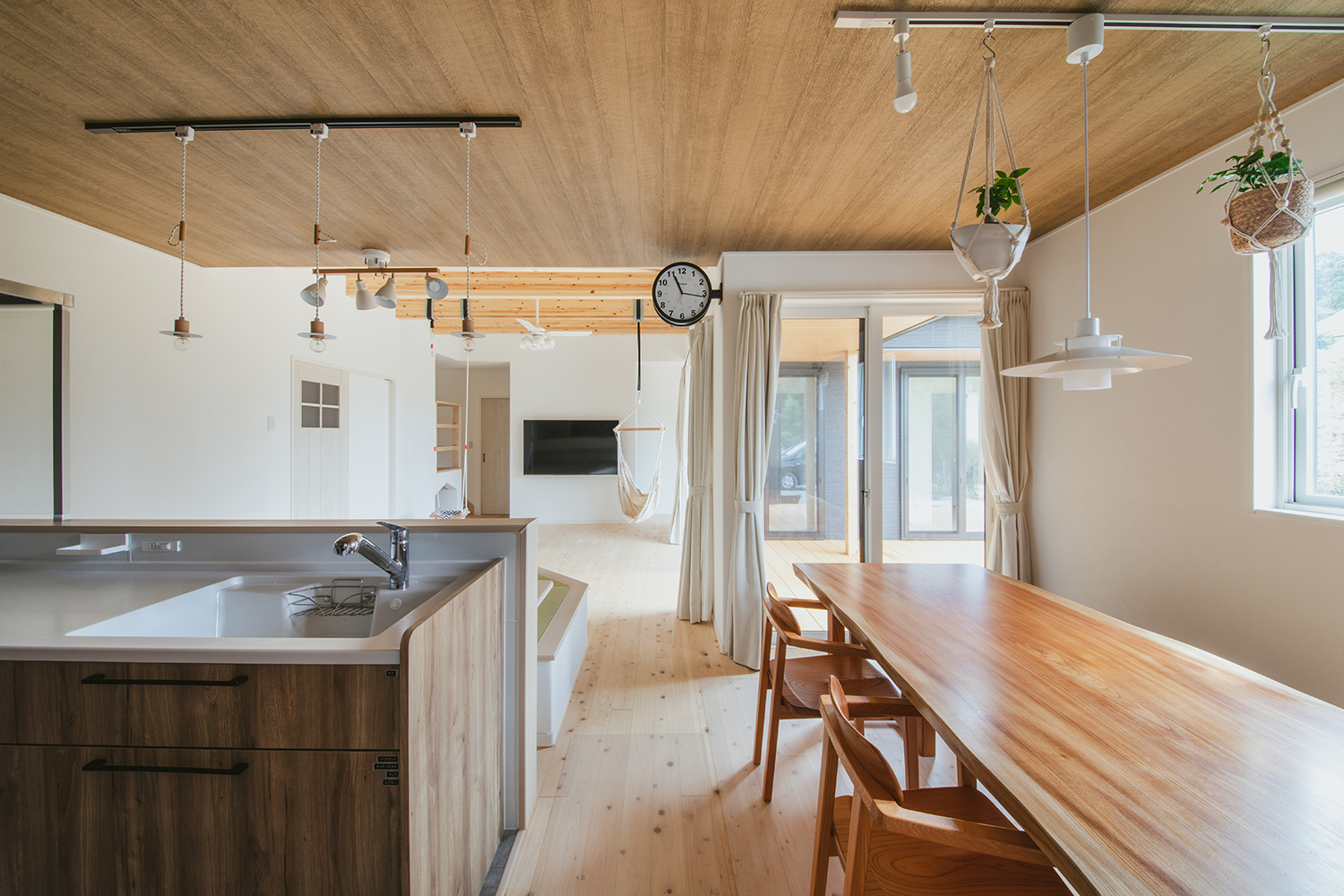 キッチンまえの小上がりのカウンターでは、お子様が勉強をしたり、おやつを食べたり、家族で畳にごろんとくつろいだり使い方色々。