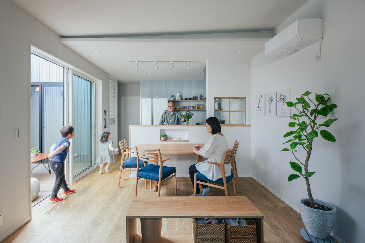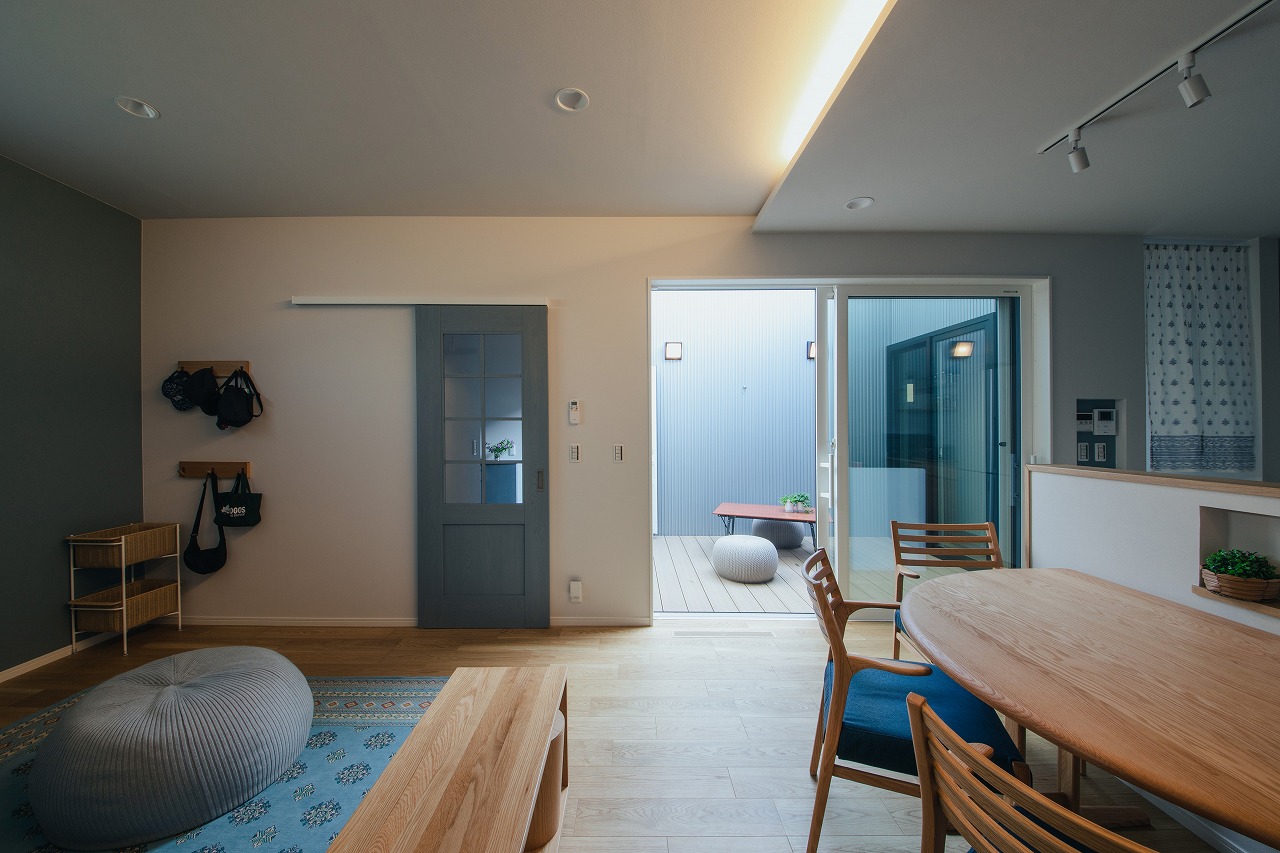 LDKは勾配天井で、差し色にグレイッシュブルーを取り入れてコーディネート。コンパクトなLDKはソファを置かずにすっきりと限られた広さでも中庭があるから広々と感じられます。