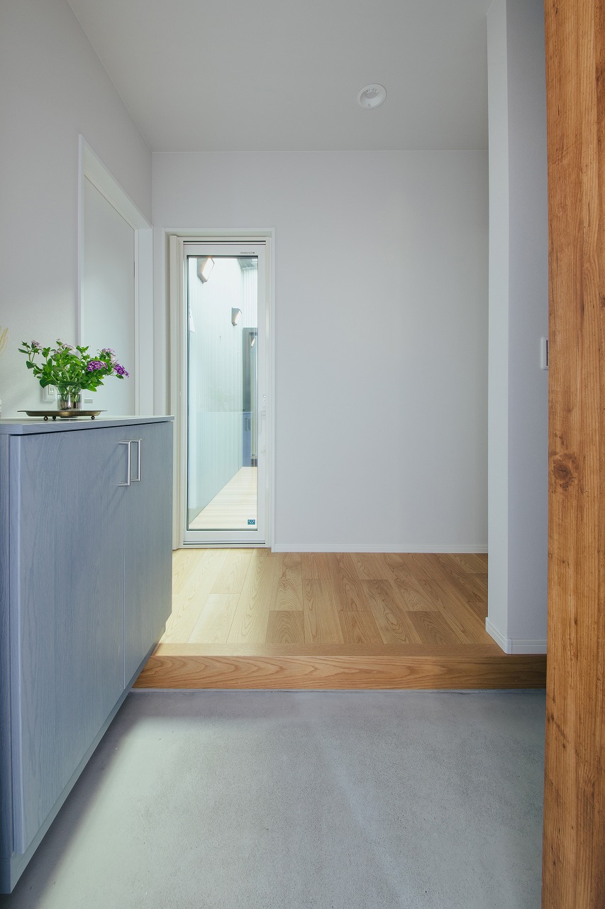 玄関ホールからのぞく中庭。玄関ホールからも、廊下からも中庭に入れるのでぐるりと回遊出来ます。
