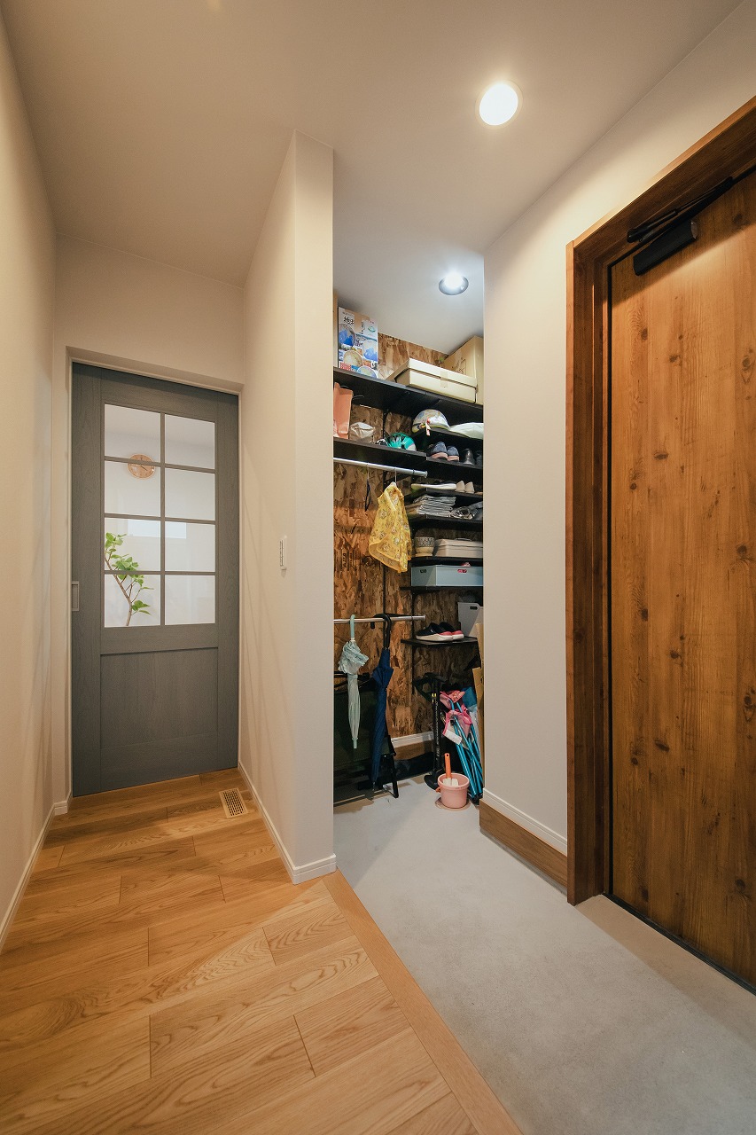 玄関横のシューズクロークは扉をあえてつけずに使いやすさを重視しました。中庭で使う椅子や折りたたみテーブルも収納出来る容量がうれしい。